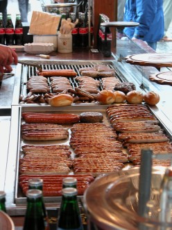 A smoked, spiced German sausage made of pork, veal and sometimes beef.