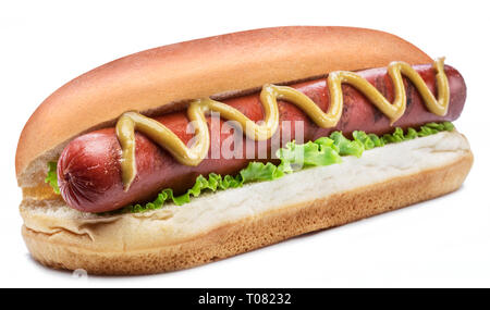 Bratwurst Wurst mit Brötchen und Senf auf einem Pappteller ...